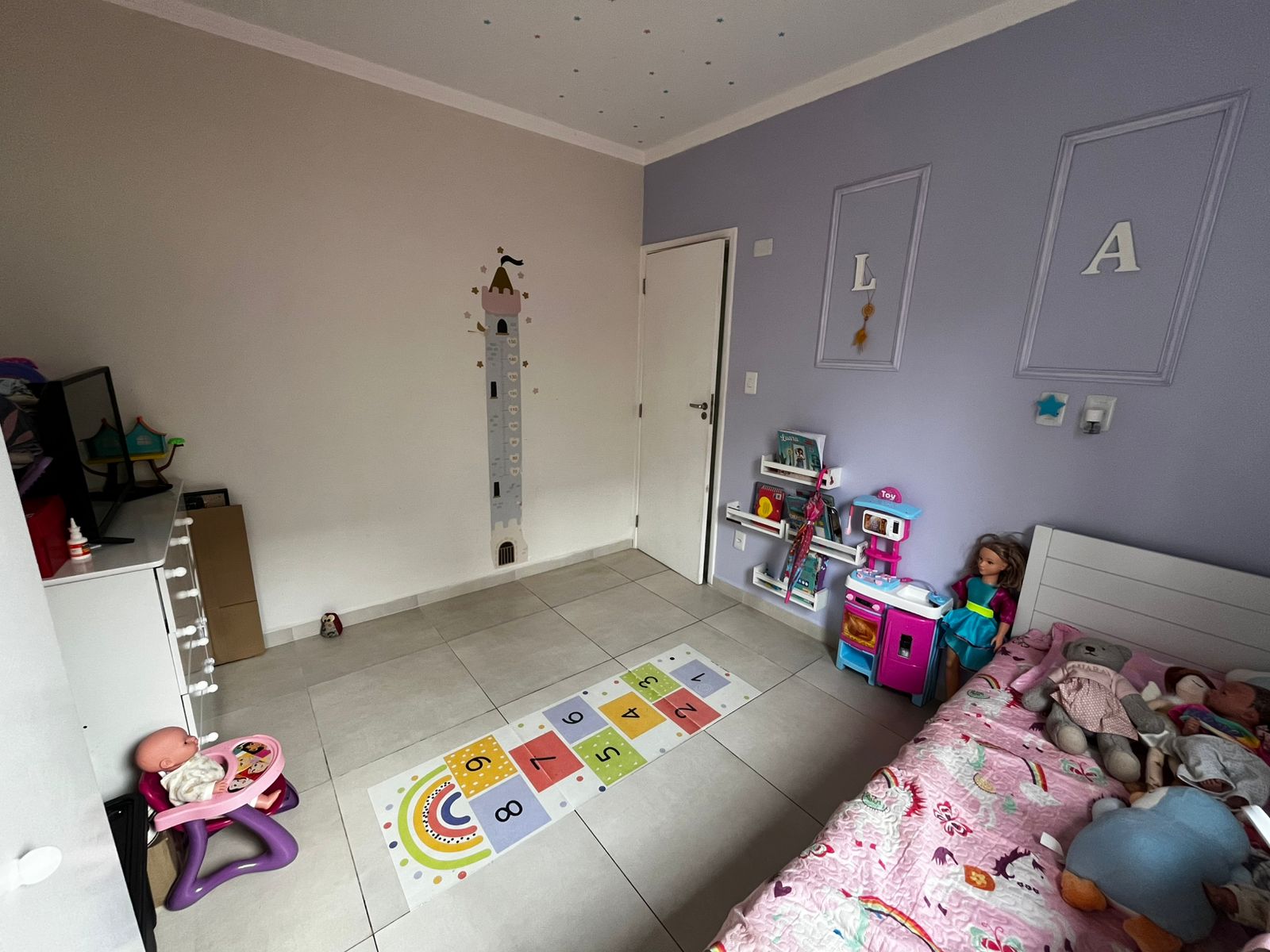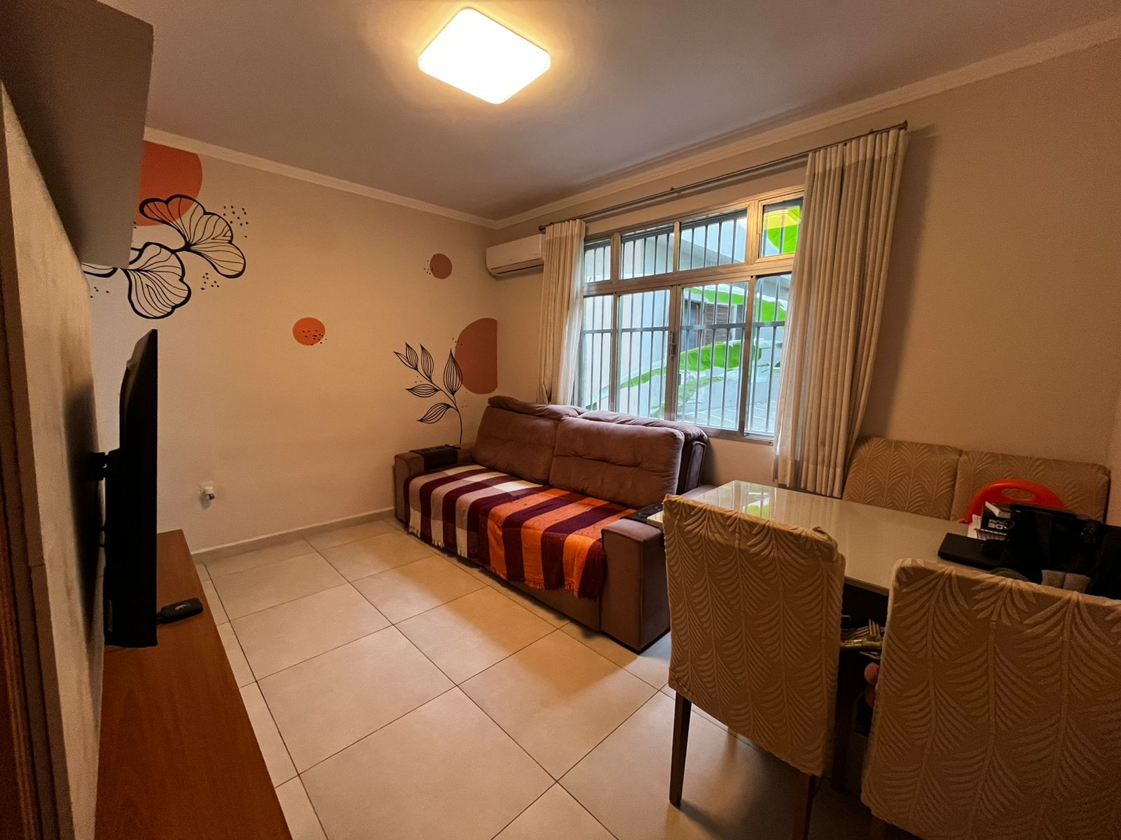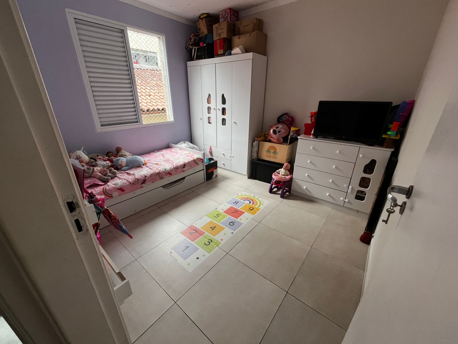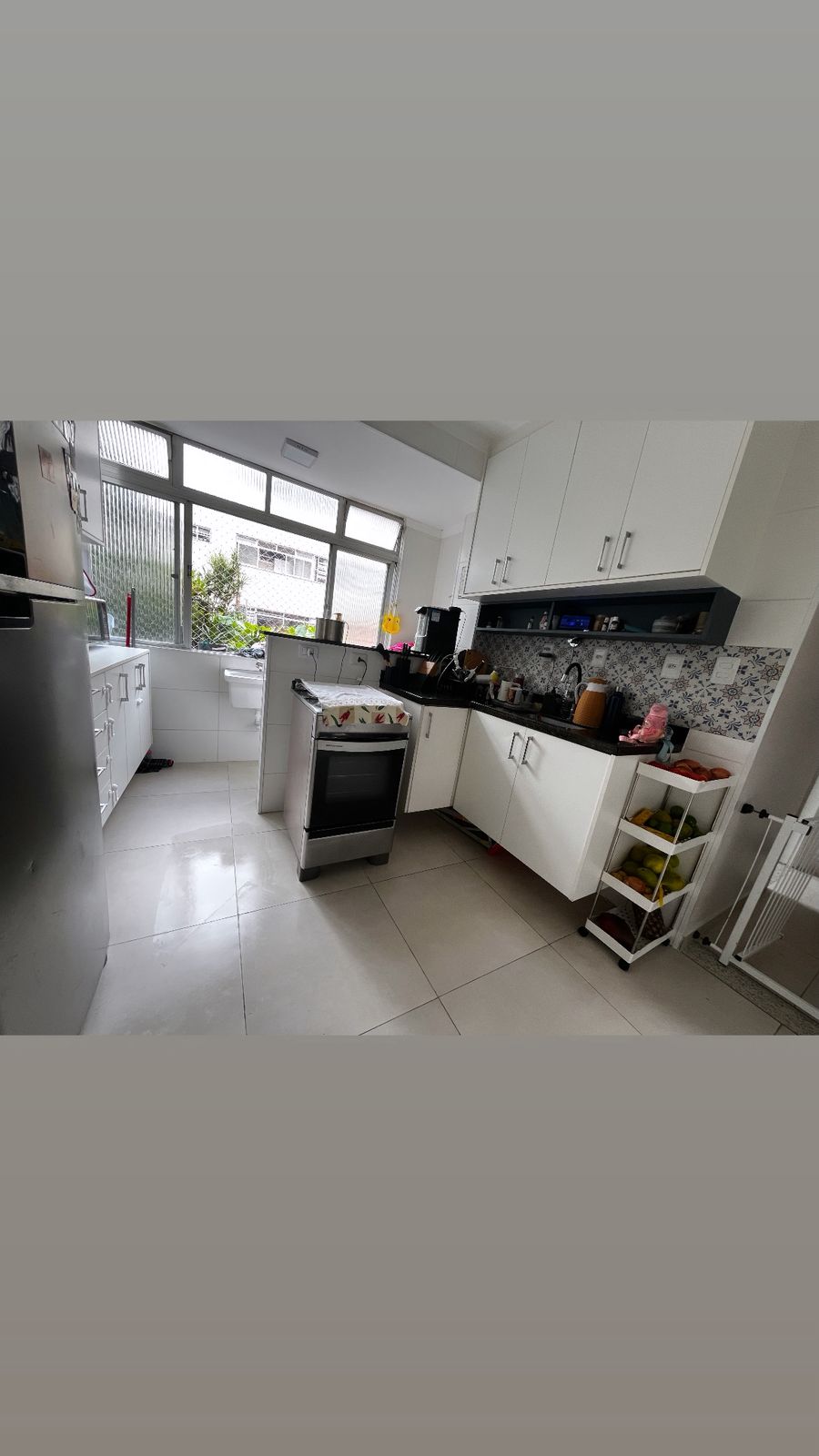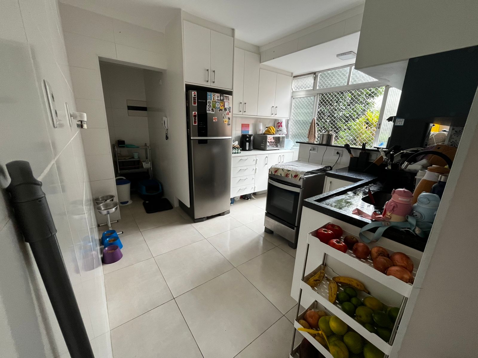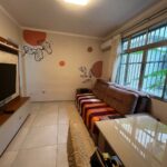 Sala ampla para dois ambientes, dois dormitórios, banheiro social, cozinha com armários, área de serviço, prédio de escada primeiro andar, garagem coletiva.
